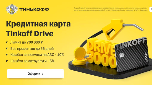 3000 Баллов +10% кешбэк АЗС +5% АвтоУслуги,Штраф ГИБДД Беспл. Кредит карту Тинькофф Drive 55 Дн. БЕЗ % 700000₽ оформи 2023 г.+Беспл. доста.