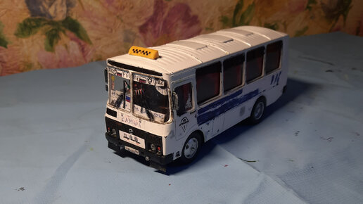 Всем привет ребята. Сегодня я расскажу вам о модели ПАЗ 32053 от " автотайм". До дороботки ПАЗик был такой: Сейчас он такой: Были убраны все надписи, на крышу добавлена шашка. Спереди на капоте надпись САМАРА, добавлены номера, на стекле добавлены элементы колхоза, под бампером брызговики. Сзади на стекле штора,наклейки и номер маршрута. Также добавлены номера, надпись на берлин...