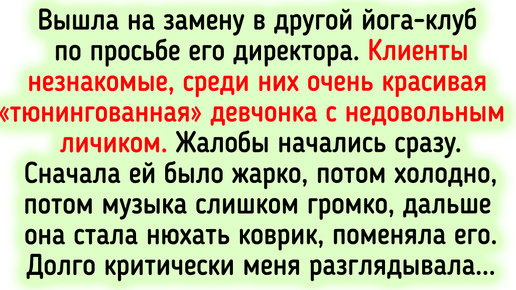 На работе, помимо самой работы, происходит куча всего: то коллега в тарелку заглядывает, то подруга по знакомству пытается пролезть в ту же компанию, что и вы, а иногда и работа даже не ваша, а мужа, но нервишки она и вам треплет. Разнообразие рабочих будней во всей своей красе — в этой статье. Вышла на замену в другой йога-клуб по просьбе его директора. Клиенты незнакомые, среди них очень красивая «тюнингованная» девчонка с недовольным личиком. Жалобы начались сразу. Сначала ей было жарко, потом холодно, потом музыка слишком громко, дальше она стала обнюхивать коврик, поменяла его...