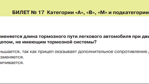 Чищу архив. Нашел обращение гражданина, который сомневался в правильности ответа на вопрос 19 билета 17. Дескать, не согласен, что тормозной путь с прицепом без тормозной системы увеличивается, потому как прицеп тоже весит много. Предлагал поэкспериментировать. Комментарии авторов билетов его не устроили. Привожу фрагмент подготовленного ответа. Начальник был в восторге и зачитывал его нам на совещании. В принципе, я согласен, что такие вопросы в билетах совершенно ни к чему, но задача была поставлена, пришлось выполнять...