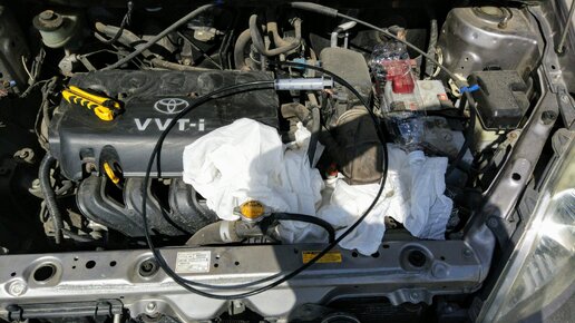После пару дней езды, заметил, что в сервисе мне залили лишнего масла в коробку или оставили. Решил сам немного слить, и посмотреть, какого цвета трансмиссионное масло после замены в Тойоте Витц 1.3. Так как думаю, что остатки старого и грязного маслица присутствует ещё в коробке. Для этого я взял тряпок немного, бутылку 1 литр, шприц 20 мл из аптеки и шланг, который ровно налез на носик шприца. Высасывал прямо из отверстия щупа проверки уровня масла в АКПП. Процедура без проблемная, но долгая была из-за маленького шприца(надо больше объем)...