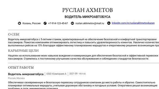 Изучите наш пример резюме водителя на микроавтобус, чтобы составить свое быстро и эффективно. Получите работу своей мечты благодаря правильно структурированному документу. 💪 На нашей странице представлен полный гайд, как составить документ, который соответствует всем требованиям работодателей. Вы найдете для успешного трудоустройства как начинающих, так и опытных водителей. Изучив пример, вы сможете создать резюме с помощью нашего конструктора резюме. Создайте профессиональное резюме сегодня! ✨ Заголовок резюме – это первое, на что обращает внимание работодатель...