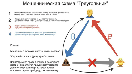 В ней участвуют трое: мошенник, P2P-шник и жертва. Как это все работает. Мошенник создает объявление о продаже машины, телефона или любого другого предмета, с ценой на 40-50 % ниже рынка, соответственно любой человек захочет купить или оставить предоплату. Как же дальше действует мошенник ? Он заходит на P2P и открывает сделку с трейдером на сумму покупки или предоплаты и выставляет ордер. Далее трейдер дает реквизиты для оплаты своей жертве и тот оплачивает. Таким образом, продавец получает свои деньги, мошенник крипту, а жертва остается у разбитого корыта...