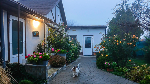 Слева на фото можжевельник и восточные туи, справа куст буддлеи, так и не сбросившей листву, а также жёлтые стебли мискантуса. Идём с корги Тильдой на утреннюю прогулку. Дождя ночью не было, а тропинки в саду мокрые. В воздухе разлита влажность. Вышла из дома самая осторожная в мире кошка по имени Кокошка. Интересно ей, чем мы с Тильдой занимаемся, но не присоединяется, робеет перед собачкой. Следит издалека да ещё постоянно оглядывается по сторонам. На фото с Кокошкой (вверху) всё слегка расплывается...