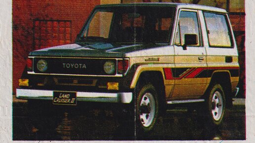 Ах как жаль, что этот вкладыш не попал к нам в 80-е, он бы точно пользовался заслужнной популярностью. Ещё бы! Настоящий внедорожник с правильными и очень внушительными формами, знаменитая марка, а какое солидное название: "Land Cruiser"! Да за одно такое название машину бы обожали. Также к однозначным достоинствам вкладыша можно смело причислить приятную, будто бы специально выверенную цветовую гамму, удачную компоновку — автомобиль занимает правкиически всю площадь поля изображения, и, конечно же, естественный фон — да тут есть, что поразглядывать...