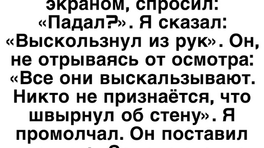 Мастер, принимая мой телефон с разбитым экраном, спросил: «Падал?». Я сказал: «Выскользнул из рук». Он, не отрываясь от осмотра: «Все они выскальзывают. Никто не признаётся, что швырнул об стену»...