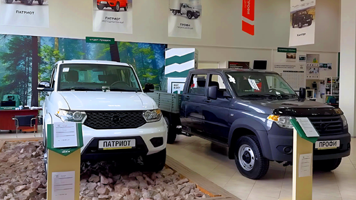 Рабочий день в самом разгаре, салон официально открыт, но встречать покупателей некому. Единственный менеджер куда-то испарился, оставив выставочный зал пустым. Зато появилась возможность спокойно осмотреть технику без навязчивых продавцов. В экспозиции три модели: белый Патриот, бортовой Патриот и легендарная "буханка" - она же УАЗ Комби. Патриот базовый Белый Патриот в комплектации "Баскар" с мотором 149 л.с. выглядит максимально бюджетно. Без рейлингов, без антенны, на штампованных дисках - автомобиль производит впечатление недоукомплектованного...