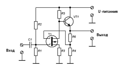 Всем здравствуйте! Как то на досуге, а досуг на пенсии ... , пришла идея высоколинейного, высокодинамичного, малошумящего (во сколько всего) усилителя, да ещё и с приличной нагрузочной способностью. Правда инвертирующего. Схема его нестандартна, представлена на рисунке ниже. Усилитель двухкаскадный, но суть в том, что для создания ООС используется второй затвор двухзатворного полевого транзистора. Глубина ООС не велика, около 20 дб, и в основном определяется тем, что крутизна по второму затвору, по паспортным данным, для транзистора КП350 примерно в десять раз меньше, чем по первому...