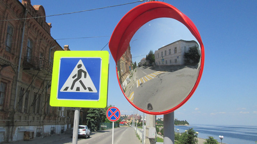 В Камышине появилось первое дорожное зеркало безопасности. Оно же «обзорное уличное». Сферическое зеркало установлено на т-образном перекрёстке улиц Набережной и Октябрьской. Отныне водитель, следующий по улице Набережной, может посмотреть в сферическое зеркало, чтобы увеличить угол обзора и убедиться в отсутствии пешеходов на переходе и безопасности проезда или поворота. Дорожное зеркало — устройство, которое позволяет водителям контролировать дорожный поток в местах, где видимость ограничена зданиями (в городе) или особенностями рельефа (на природе)...