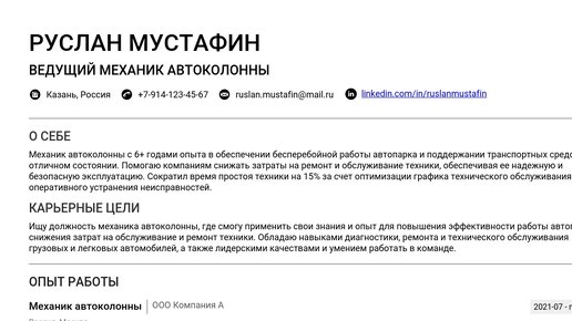Пример резюме механика автоколонны 2025 - готовые примеры
