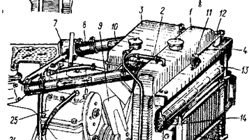 СИСТЕМА ОХЛАЖДЕНИЯ ДВИГАТЕЛЯ. Температуру охлаждающей жидкости двигателя можно регулировать не только автоматическими термостатами, но и вручную, изменяя количество воздуха, проходящего через радиатор. Для этого перед радиатором установлена шторка, управляемая цепочкой из кабины водителя. К системе охлаждения подсоединены котел пускового подогревателя и насосный агрегат. Водяной радиатор 1 (рис. 8) состоит из верхнего и нижнего бачков, соединенных охлаждающим элементом — остовом. Остов радиатора...