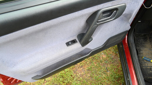 Начал с того, что в двери установил клавиши управления стеклоподъёмниками. Клавиши взял от Калины, они смотрятся красиво и удобно ими пользоваться. У меня в Калдине были подобные. Вырезал канцелярским ножом.