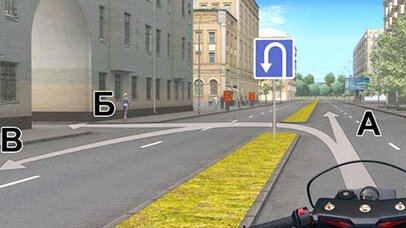 Здравствуйте дорогие читатели! Сегодня с Вами разберем еще один вопрос из экзаменационного билета. Вопрос простой, но вызывает затруднение. И мы сегодня его разберем. Вопрос в билете звучит примерно вот так: В каком направление Вам нельзя продолжить движение? Вопрос имеет вот такие варианты ответов: 1. В направление Б или В. 2. В направление А. 3. В направление Б. Уже знаете правильный ответ? Не торопитесь, дочитайте статью до конца и убедитесь в нем. Давайте разберемся. Мы едем по левой полосе, у нас есть знак, который указывает место разворота...