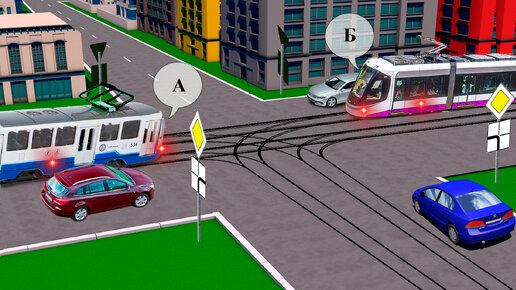Кому из участников движения, водитель синего автомобиля, должен уступать дорогу? 1. Трамваю А 2. Обоим трамваям. 3. Обоим трамваям и водителю красного автомобиля. 4. Обязан уступать дорогу всем участникам. 5. Не уступает дорогу никому. Правильный вариант ответа в конце статьи. Ссылка на ПДД. 13.9. На перекрестке неравнозначных дорог водитель транспортного средства, движущегося по второстепенной дороге, должен уступить дорогу транспортным средствам, приближающимся по главной, независимо от направления их дальнейшего движения...