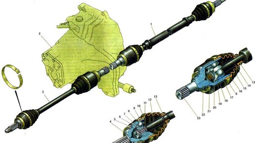 1. Привод правого переднего колеса; 2. Коробка передач; 3. Привод левого переднего колеса; 4. Корпус наружного шарнира; 5. Стопорное кольцо обоймы шарнира;