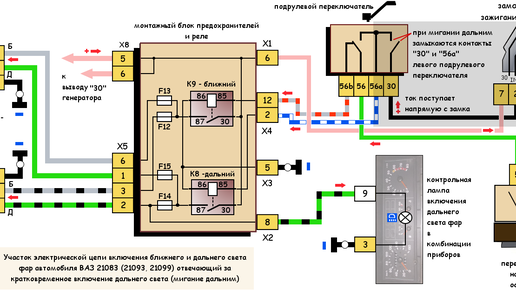 На примере электрооборудования автомобиля ВАЗ 21083 (21093, 21099) разберемся с причинами неисправности "не работает кратковременное моргание дальним светом фар". Признаки неисправности Водитель пытается моргать (мигать) дальним светом перемещая на себя рычаг подрулевого переключателя. Но в результате ни чего не происходит. Фары как горели ближним светом, так и продолжают им гореть. Особенности включения и выключения дальнего света фар Для начала пара слов о том как работает включение дальнего света фар на автомобилях ВАЗ 21083, 21093, 21099 и их модификациях...