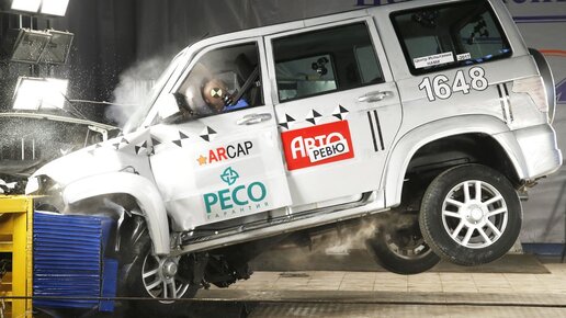 Всем привет! Начну с того, что всего проводилось 2 краш теста "Патриота" Двух поколений. Первый краш тест проводился в 2010 году При ударе кузов оторвало от рамы. Педаль тормоза сместилась на 272 мм. руль сместился на верх на 200мм. В результате краш теста, УАЗ Патриот первого поколения набрал 2.7 балла из 16 возможных. Модернизированный Патриот отработал удар лучше своего предшественника...