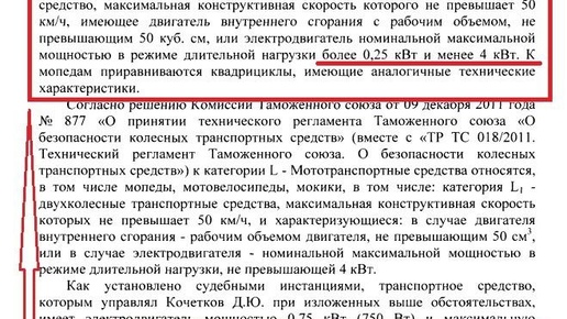 имеющее двигатель внутреннего сгорания с рабочим объемом, не превышающим 50 куб. см, или электродвигатель номинальной максимальной мощностью в режиме длительной нагрузки более 0,25 кВт и менее 4 кВт. К мопедам приравниваются квадрициклы, имеющие аналогичные технические