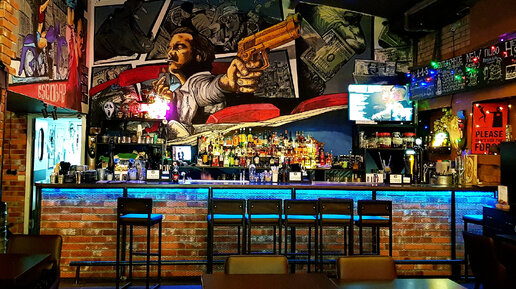 Обед за 1000 рублей и интерьер в пабе "Эскобар", где перед входом мотоциклы стоят в несколько рядов.