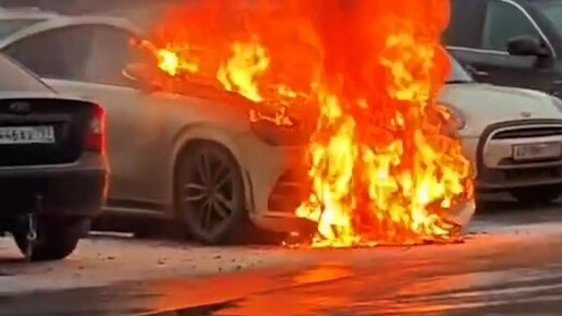 Появилось видео со сгоревшим дотла новым Mercedes у ТЦ «Коньково» в Москве