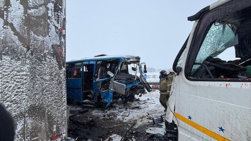 В Сети появилось видео момента массового ДТП с участием пассажирского автобуса и нескольких грузовых автомобилей, произошедшего в Любинском районе Омской области 20 декабря. Кадры были сняты на видеорегистратор одного из проезжающих мимо большегрузов. На записи видно, как грузовой автомобиль «Вольво» выезжает на полосу встречного движения, после чего происходит столкновение с автобусом ПАЗ, а затем — с КамАЗом. undefined Авария произошла около 11:55 по местному времени (08:55 мск) на автодороге Тюмень — Омск...