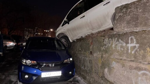 Полёт над Владивостоком: Nissan Note совершил «прыжок веры» с подпорной стены на Honda Fit