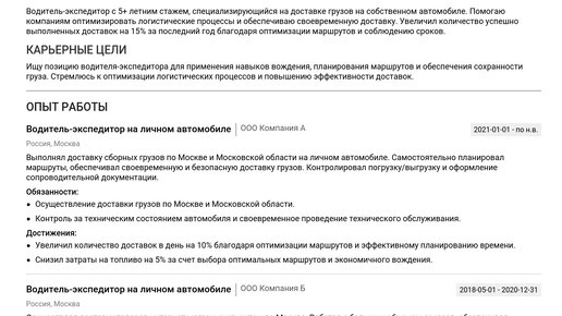 Пример резюме водителя-экспедитора на своем автомобиле 2025