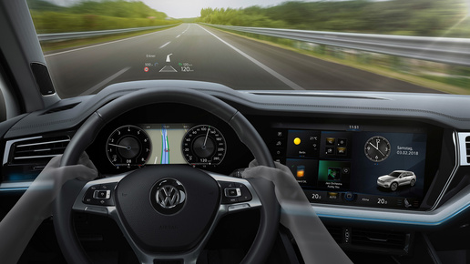 В сравнении с предшественником, новый Фольксваген Туарег значительно больше укомплектован электронными ассистентами. Например, это так называемый Innovision Cockpit. Он представляет собой полностью цифровой интерактивный интерфейс. Проекция данных на лобовое стекло является продолжением приборки. На новом Туареге стоит самый большой проекционный экран, предлагаемый для автомобилей этой марки. Его размер - 217 × 88 мм. У водителя есть возможность настраивать оптимальное положение проекции по высоте и её содержание...