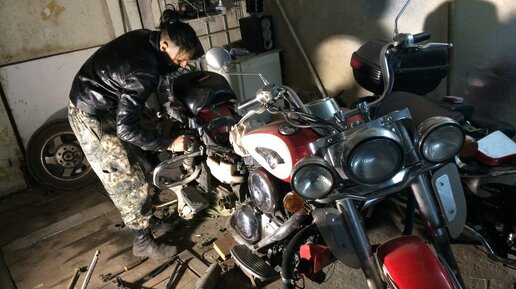 весь спектр работ) ТОЖЕ НУЖНО? ЗАПИШИСЬ! ЧТО БЫЛО СДЕЛАНО: 1 РЕМОНТ Мотоцикл был пригнал зимой из Сибири и требовал срочного ТО, в процессе которого было обнаружена необходимость замены части электрики. Электрику оставили на потом, но через месяц мотоцикл приказал долго жить, так как отказало все. Пришлось воскрешать его по месту: А именно: переборка монтажного блока. 2 РЕМОНТ Загудел редуктор. Был заменен подшипник и шайбами был отрегулирован редуктор. 3 РЕМОНТ Была произведена замена сцепления на Кавасаки Вулкан 1500...
