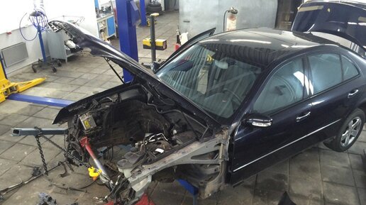 Итак, очередной пациент нашего сервиса на кузовной ремонт с индексом W-211. Мерседес в 211 кузове конечно не эксклюзив, но тем показательнее будет рассказывать о его восстановлении. Автомобиль очень аккуратно засадили в лоб, когда тот находился без движения. Возможно, поэтому не сработала ни одна подушка безопасности. Хотя они присутствовали и были исправны. Но тем лучше для владельца, тем более что никто не пострадал и даже не успел испугаться. Удар пришёлся немного по касательной слева на право, поэтому правое крыло не затронуто, а всё, что левее имеет разрушение и деформацию...