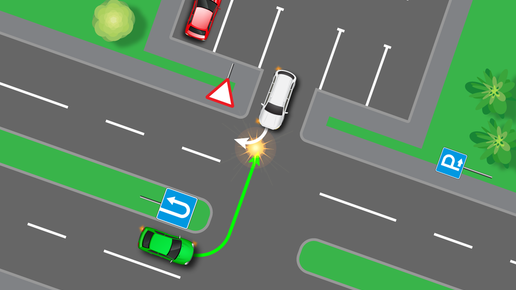 Имея преимущество при движении на дороге или при совершении маневра, можно внезапно оказаться виновным, если произошло ДТП. Конечно, в первую очередь, внимание на знаки – и тут они на нашей стороне, ведь «Уступи дорогу» гласит о том, что один из водителей должен уступить дорогу другим участникам движения, но кто из них? Автомобиль белого цвета покидает стоянку, ему нужно повернуть направо. А в это же время машина зеленого цвета желает припарковаться там, откуда выезжает белый автомобиль. Зеленый автомобиль при движении пересекает главную дорогу и тут же сталкивается с белым автомобилем...