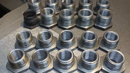 🔸Изготовил два комплекта ремонтных ввёртышей в блок головки цилиндров под свечи зажигания. Комплект #1 с резьбой М18х1,5/М14х1,25, комплект #2 с резьбой М20х1,5/М14х1,25. Материал: сталь Ст45. 🔸Ввёртыши пойдут для автомобилей ЗИЛ. После разрушения резьбы в блоке цилиндров, обычно используется ремонтный переходник с резьбой М18х1,5/М14х1,25. Но когда и этот вариант изношен, как в данном случае. Наступает план "Б", требуются переходники М20х1,5/М14х1,25. Но это крайний вариант...