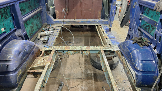 Работа с машиной маленькими шагами, но двигалась постепенно, еще с лета. Первоочередная задача - вырезать гнилье, максимально разобрать кузов для очистки под ремонт. После плоскости пола в заднем отсеке ампутировал короба - упоры для пружин подвески. Многослойная конструкция сильно прогнила, проще изготовить заново, чем вычищать и кроить заплатки. Предварительно, конечно, засек расположение относительно других элементов. Часть пола за водительским сиденьем выглядела вполне прилично. Но мы то знаем...