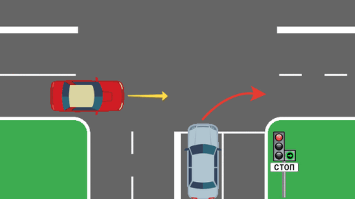Как показывает статистика, некоторые водители пренебрегают одним из основных пунктов ПДД в пользу разрешающего сигнала доп. секции светофора. Для проверки своих знаний, ознакомьтесь с иллюстрацией, прочитайте условие и вопрос, сформируйте ответ и сравните его с нашим решением. Условие: водитель серого автомобиля намерен повернуть направо, согласно разрешающему сигналу дополнительной секции светофора из левого ряда. Вопрос: разрешается ли повернуть направо в показанной ситуации? Варианты ответа: 1...