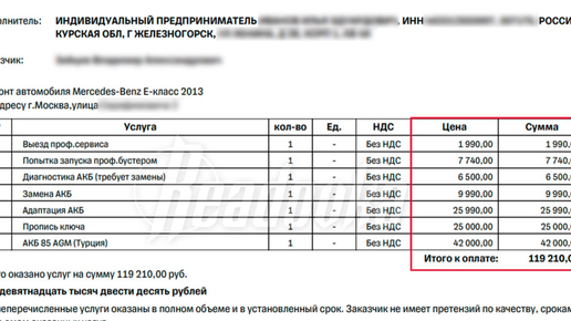 Жителю столицы необходимо выплатить 119 тыс рублей после вызова выездного автосервиса. В подробностях этой истории разбиралась Readovka. Москвич Владимир по просьбе находящегося за границей брата попытался отвезти его Mercedes E-Class в сервис, но авто не заводилось. Мужчина рассказал Readovka, что тогда он позвонил в компанию, занимающуюся выездным автосервисом. Через час на место приехали мастера. Сначала они безрезультатно пытались «прикурить» автомобиль, затем проверили аккумулятор, заявив, что его необходимо заменить...