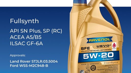 Масла RAVENOL закрывают все потребности покупателей по официальным допусками европейских, американских и азиатских производителей. Моторное масло RAVENOL Super Fuel Economy SFE 5W-20 Лицензия API: SN Plus, SP (RC) Спецификация ACEA: A5/B5