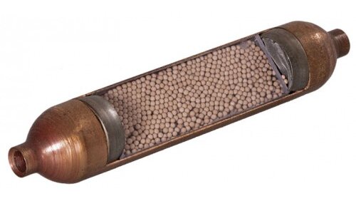 Фильтр-осушитель - элемент контура холодильного агрегата, устанавливается у входа в капиллярную трубку для предохранения ее от засорения твердыми частицами, для поглощения влаги из фреона и предотвращения замерзания ее на выходе из капиллярной трубки. Корпус патрона фильтра состоит из медной трубки длиной 105-140 мм и диаметром 18..12 мм с вытянутыми концами, в отверстия которых впаивают соответственно трубопровод конденсатора и капилляр. В корпус фильтра помещают цеолит между молекулярными сетками, установленными на входе и выходе из патрона...