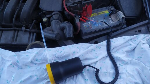 Вакуумный насос для откачки моторного масла я купил давно, вот мой обзор. Пришло время проверить его в деле. 1.Подключаем на всасывающий патрубок насоса жесткую трубку, вставляем ее в отверстие из-под масляного щупа. 2.На отводящий патрубок подключаем мягкую трубку и выводим ее в емкость для отработки. 3.Подключаем и сам насос к аккумулятору. Для уменьшения доли оставшегося масла ставим машину с наклоном в сторону масляного щупа, через который будем выкачивать масло. 4.Открываем крышку заливной горловины мотора и включаем насос...