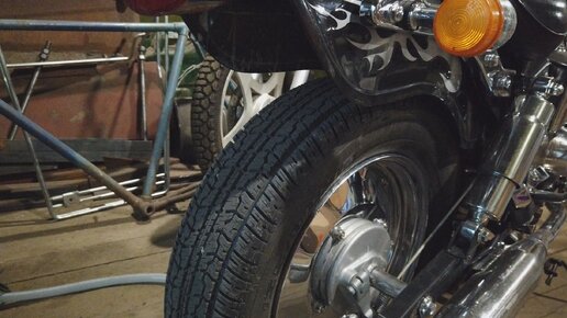 Всем привет! Наконец то я заменил рваную резину на заднем колесе,на покрышку от Оки,ну и поменял масло в двигателе т.к. проехал на нём более 1000 км.!