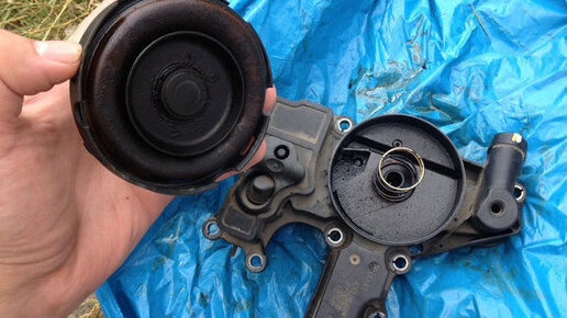 Маслоотделитель — это такая штука, которая, как ни парадоксально, отделяет масло от картерных газов, направляемых во впуск. При засорении эффект очистки падает, а результат проявляется в виде повышенного угара масла, в более запущенных случаях — нестабильной работы двигателя (особенно, на малых оборотах). Конструктивно, фишка сего девайса на многих современных моторах — в тонкой резиновой мембране. Но если вы забьете в Яндекс тупо "мембрана маслоотделителя" — разумеется, в ответку вы получите мировой опыт замены сего чуда исключительно на двигателях от горячо нами любимого VAG...