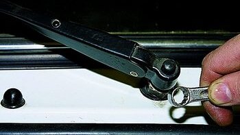 Отсоединяем «минусовой» провод аккумуляторной батареи. Снимаем очиститель ветрового стекла для замены моторедуктора или деформированных деталей рычажного привода. Для снятия поводка… …ключом «на 10» отворачиваем гайку его крепления. Покачивая, снимаем поводок. Если поводок снимается туго,… …можно воспользоваться ключом «на 17», действуя им как вильчатым съемником. Для снятия очистителя ветрового стекла снимаем оба поводка. Ключом «на 21» отворачиваем гайку крепления втулки рычага к кузову. Снимаем уравнитель… ...