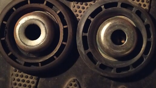 Ранее я писал, что неудачно менял верхние опоры (быстро просели), зиму проездил на родных. Однако, к весне одна сторона тоже подсела примерно на 3-5 мм, решил заменить. Сама методика известна, все делается достаточно быстро при наличии инструмента. Медная смазка при сборке не дала особых преимуществ, всё-таки графитовая смазка лучше. Вот, смотрите, состояние резьбы после зимы. А вот верхний демпфер отбоя. Замечу, демпферы ставил новые. Вот для сравнения, что было, что стало (под капотом) и родная деталь...