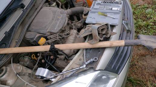 Замена правой подушки (опоры) двигателя Логан/Сандеро за 10 минут без домкрата с помощью лопаты.