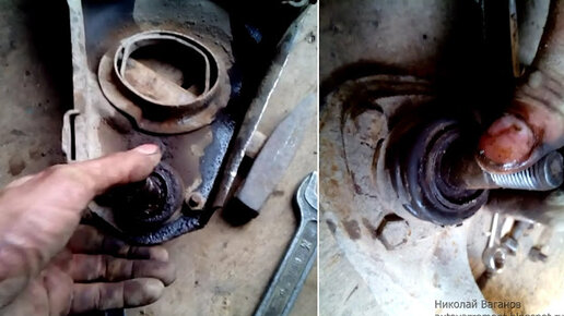 Так, в прошлый раз мы демонтировали передние рычаги, теперь перейдем к замене изношенных шаровых опор, соответственно, верхней и нижней. Снимаем старые опоры с рычагов, зачищаем посадочные места от грязи. Перед установкой новых опор их необходимо проверить на наличие смазки и разработать. Начнем с верхней опоры. Для этого небольшой отверткой отжимаем стопорное кольцо вверх и снимаем резиновый пыльник. Как мы видим, смазка присутствует в достаточном количестве, однако, она вряд-ли покрывает всю рабочую поверхность шара...
