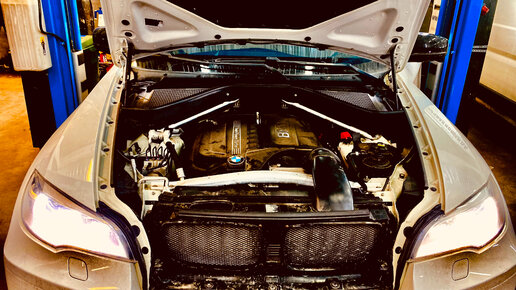 Пока не вечер, Б-ТЮНИНГ МОТОР принимает в работу BMW X6, 3л (N55), 2013 г.в., полный привод, АКПП. Пробег 160000 км.. Известно что N54 и N55, были разработаны на базе атмосферника N52, а что касается помпы, знаем что у системы охлаждения электрический привод. Проблемы с ней не редкость, увы. И в нашем случае, причина обращения, повышенный температурный режим в системе охлаждения, постоянно включается принудительное охлаждение, слышны щелчки в моторном отсеке со стороны помпы, хотя видимой течи нет, уровни жидкости охлаждения практически в норме, так что в общем повезло...