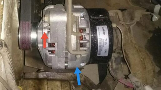 Ключом на 13 ослабляем гайку фиксации генератора. Она отмечена красной стрелкой. Далее ключом на 10 выкручиваем болт натяжения ремня. Он отмечен синей стрелкой. Крутим и двигаем генератор в сторону двигателя до тех пор, пока не снимется ремень...