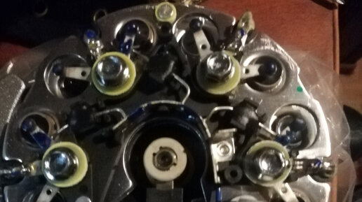 Всем привет. Меня уже замучал недозаряд аккумулятора, а именно генератор выдает 13,4-13,6 вольт, что в принципе хватает для работы авто, но аккумулятор не получает достаточного заряда. Решил я эту проблему установкой диода в щёточный узел. Для начала я снял генератор и разобрав заднюю крышку вытащил щетки. Диодный мост на вид ещё хороший, да и что ему будет за год. Зачистил мелкой наждачкой контактные кольца. Ну теперь приступаем к модернизации наших щеток. Припаиваем диод к проводу идущему к щеткам...