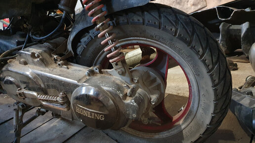 Если у вас возникла проблема, что ручка тормоза плохо возвращается назад и колодки не до конца разводятся, то следует смазать весь тормозной механизм. Конструкция заднего тормоза проста: от тормозной ручки тянется тросик, который крепится к рычагу под вариатором. Далее рычаг вращает вал, проходяший под редуктором, и раздвигает тормозные колодки. Чтобы вытащить вал и его смазать, нужно добраться до тормозных колодок и снять их. Они находятся под колесом. Для начала нам нужно снять глушитель полностью, отсоединить амортизатор от подрамника и снять сам подрамник...