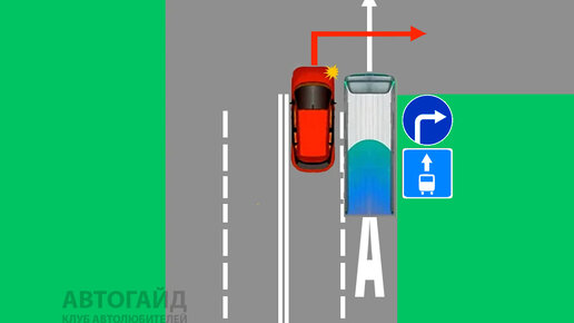 Выделенные полосы очень хороши для автобусов и их пассажиров, а вот водители легковушек на таких участках дорог часто путаются из за незнания теории ПДД. Представим что вы управляете красной машиной. Справа по полосе для ОТ едет автобус. Но подъезжая ближе к перекрестку замечаем два знака: 5.14 - полоса маршрутных ТС и 4.1.2 - движение только направо. Тогда красная машина включает правый поворотник, но автобус этого не делает, а явно хочет проехать прямо. Возникает спорная ситуация между водителями...