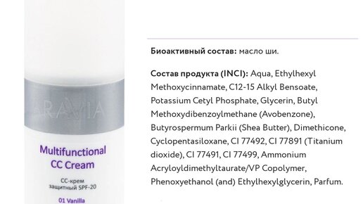 Что в составе: ARAVIA CC-КРЕМ ЗАЩИТНЫЙ SPF-20 ДЛЯ ЛИЦА MULTIFUNCTIONAL CC CREAM
